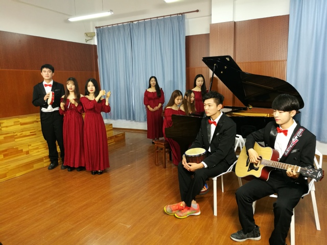 声乐教室则响起了活泼轻快的乐曲声,同学们穿着统一的服饰,有条不紊的筹备着。由张赛儿老师指导的钢琴曲《春舞小合奏》,同学们神采奕奕,以饱满的热情一遍又一遍的排练着。似鸟儿婉转歌唱,如山泉缓缓流淌。系主任侯雨豪老师亲临排练现场并提出了宝贵意见。