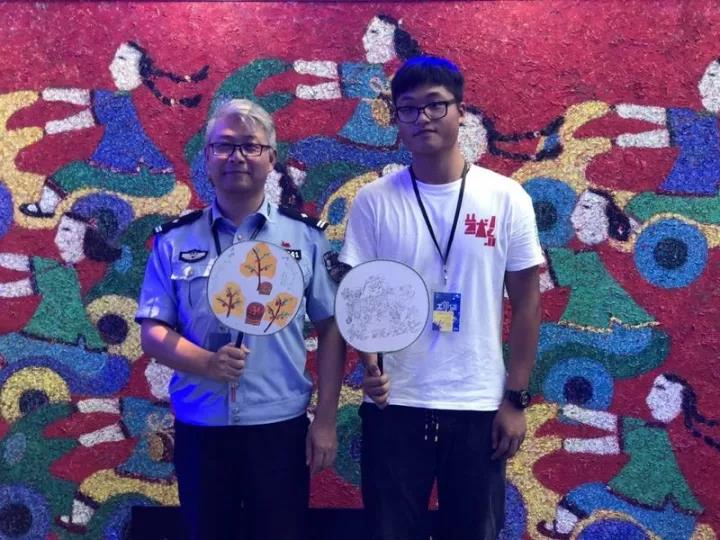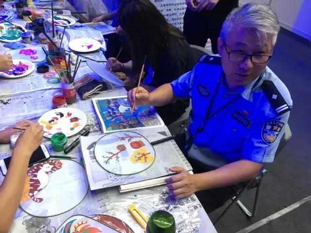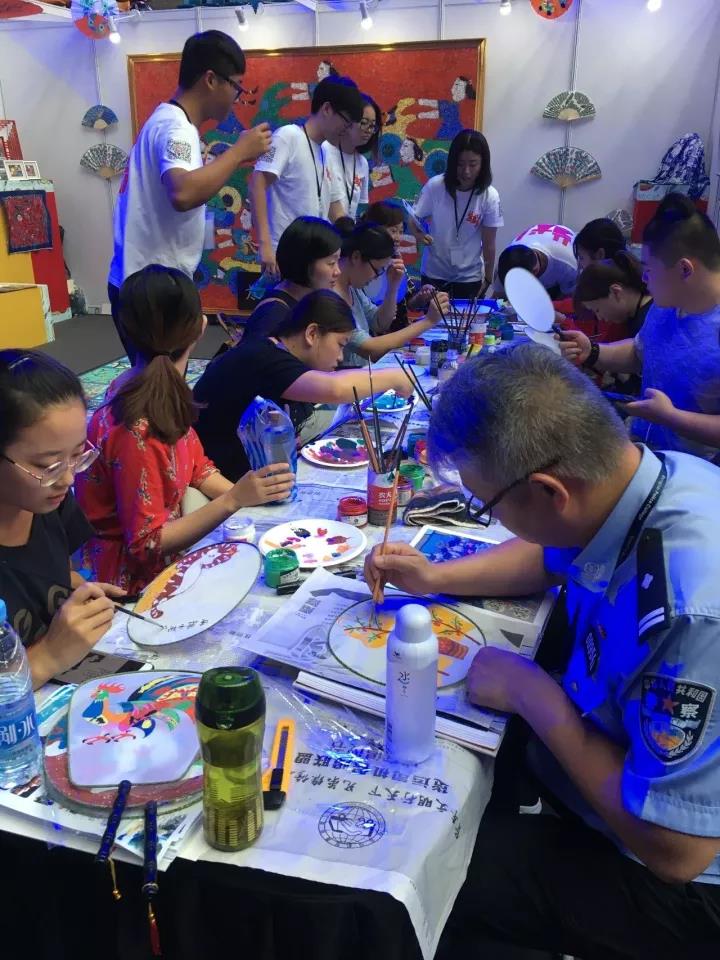 现场参观者络绎不绝,争相学画金山农民画,中侨展位成为全场最热闹的展区。艺术系志愿者热情讲解金山农民画的色彩与造型特点。一位警察慕名前来学农民画,在志愿者的指导下完美地画了一幅金山农民画圆形扇,圆了他儿时的绘画梦。