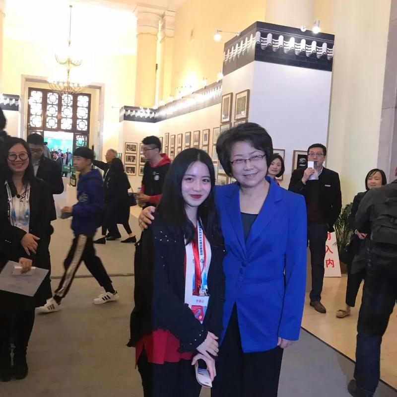 副市长翁铁慧和上海中侨学院艺术学院“非遗金山农民画大学生工作坊”学生张昱雯合影