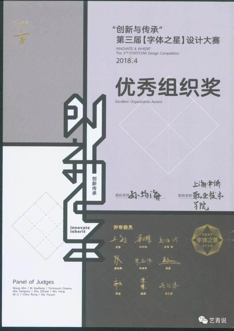 近日,由汉仪字库主办,中央美术学院、中国美术学院协办的“传承与创新”第三届“字体之星”设计大赛传来喜讯,艺术学院在此次大赛中实现了零突破,首次荣获“优秀组织奖”。