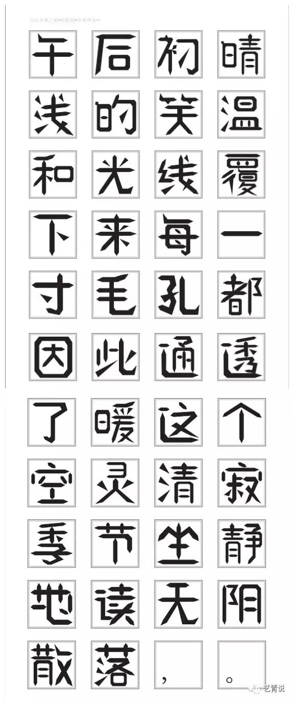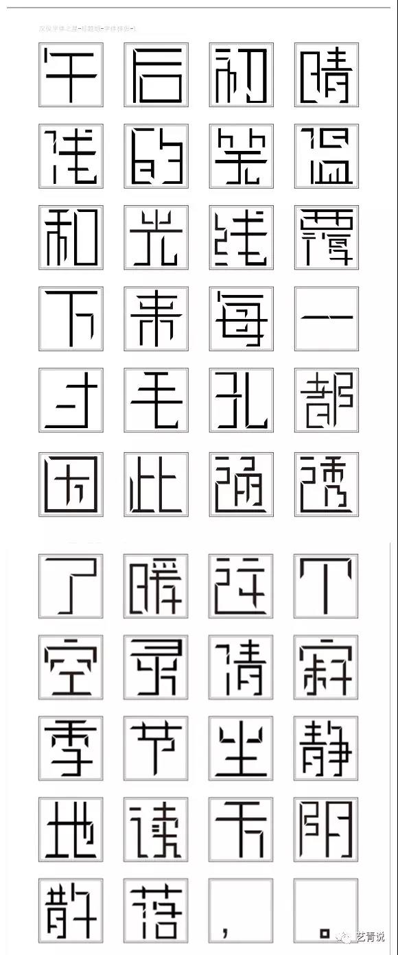 这款字体的设计来源是将字体的所有撇、捺笔画都取消,转变成弯折勾,有别于传统字体的横、折、竖、勾、弯,并且使字体的笔画的末尾变得锋利,强化了字体的挺拔和刚毅气质,具有男性的坚韧品格。