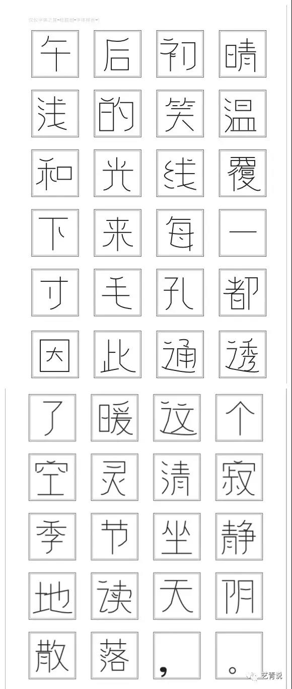 这款字体是是一款极为简单的字体,他是我根据书法的行云流水所想出来的,我认为书法的行云流水就是随心而动,极为简便,所以我设计的字体是随心设计的。