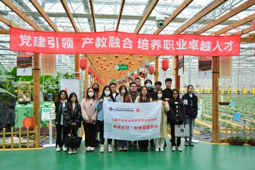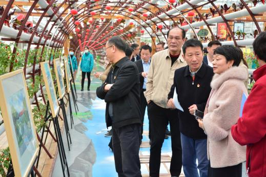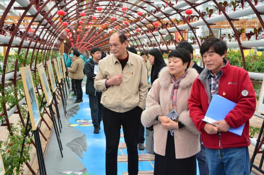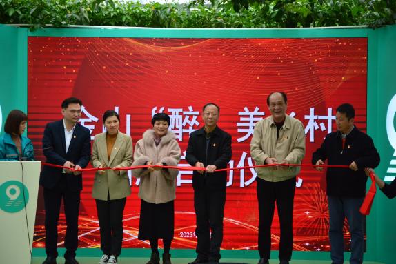 党建共建、校企合作仪式结束后,举行金山“醉”美乡村画展开幕,画展策展人朱希教授介绍到艺术学院美丽乡村志愿者服务队的同学们在党的二十大召开前夕,创作了124个最美金山乡村的艺术作品。这些作品反映了改革开放后金山村貌的变化与美丽,歌颂了习近平总书记提出的建设美丽乡村“青山绿水就是金山银山”的理念。上海九丰农场是全国现代农业园区的大型绿色生态园,位于上海醉美古镇枫泾镇盛新村,离正在建设中的乐高乐园区仅一步之遥,隔岸相望,此次展出的作品陈设在绿色盎然的生态园大棚内,让观光游客真正领略农、旅、文、教一体化发展园区建设的标准模式,探索艺术职业教育助力上海绿色田园先进片区发展的新思路,拓展本科职业教育与振兴乡村的新理念。各位领导老师也共同进行画展开幕的剪彩与合影。