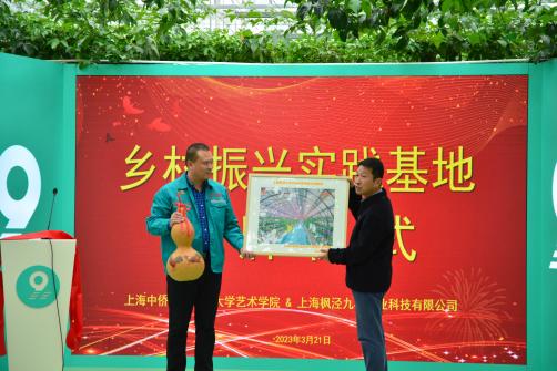 姚子斌经理和孔锦院长进行校企合作签约与“上海中侨职业技术大学乡村振兴实践基地”的揭牌仪式,双方也通过互换礼物的方式表达了将进一步增强合作意识,建立长期稳定的校企合作关系,共同推动乡村旅游和艺术产业的发展的意愿。