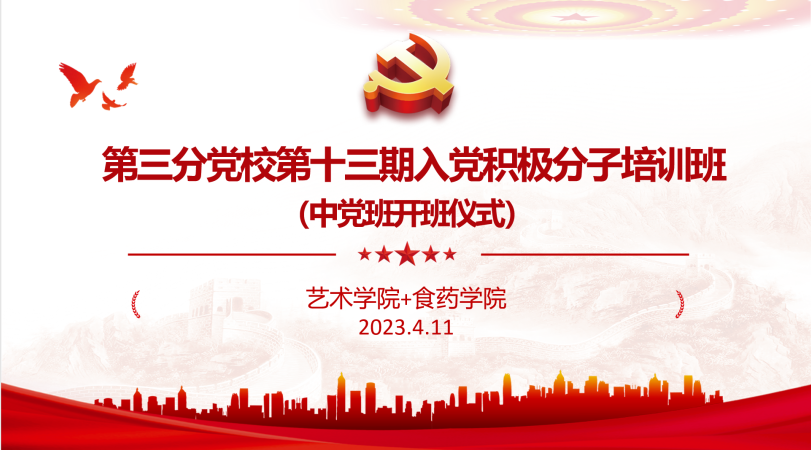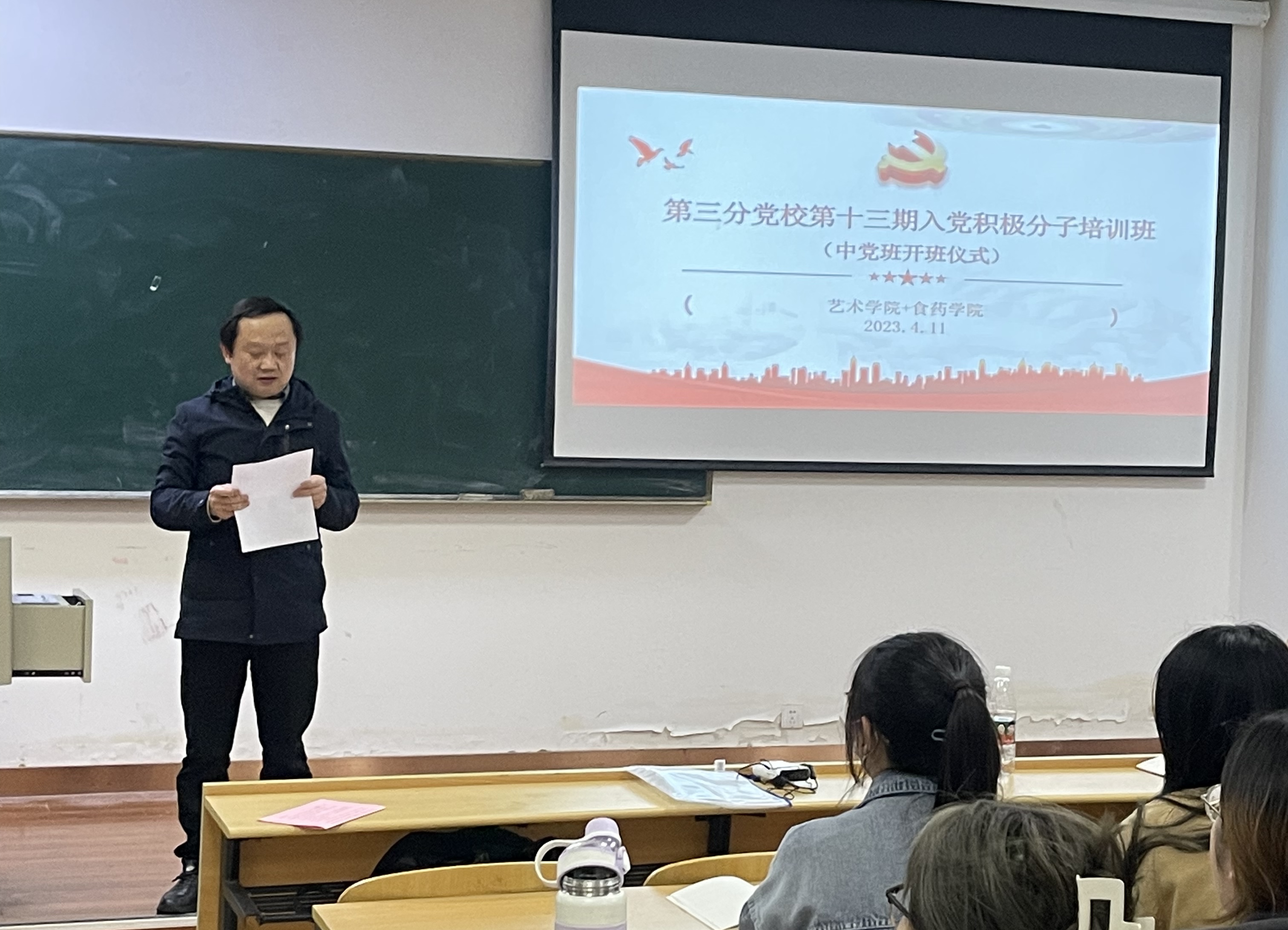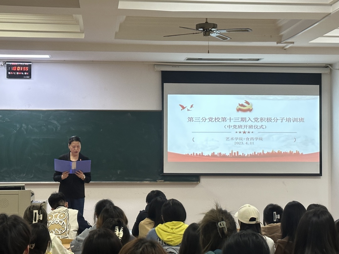 2023年4月11日晚上6点,第三分党校第十三期中党开班仪式在6号楼406举行。食品药品学院直属党支部书记、院长吴酉芝,艺术学院党总支副书记杨莉以及组织委员涂天缘、沈泳男老师和中党培训学员参加此次开班仪式,仪式由艺术学院党总支副书记杨莉主持。