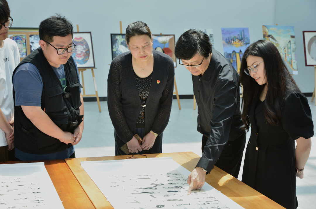 开幕式结束后,此次画展负责人谢天禹与孟泽远同学也热情的向各位老师介绍作品。李光安副院长也表示做为新时代的青年,同学们在学习课程时也要多多重视传统文化的学习,传承中华民族优秀传统文化,为新时代奉献自己的一份力量。