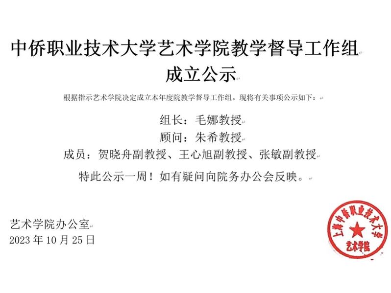 上海中侨职业技术大学艺术学院教学督导工作组成立公示