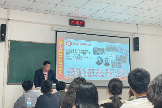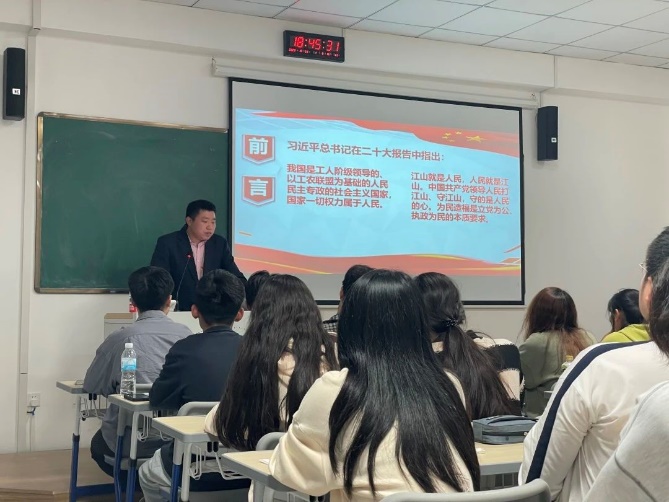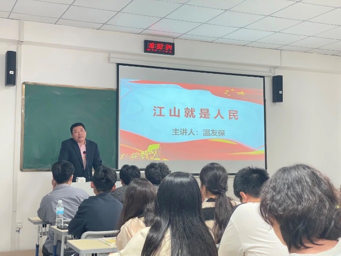 在开班动员报告结束后,智能制造学院直属党支部副书记温友保老师进行本次培训班的第一讲—江山就是人民。温老师从六个方面深入浅出向各位入党积极分子讲解了为什么说江山就是人民,这充分彰显了党以人民为中心的根本立场与执政理念,科学阐明与揭示了马克思主义政党的人民属性。习近平总书记曾经讲过“任何时候不能忘了人民这个根,做忠诚的人民的服务员。”把人民放首位,不仅要让群众真真切切感受到幸福变化,也要实实在在为群众解决后顾之忧,因为人心向背关系党的生死存亡,为中国人民谋幸福、为中华民族谋复兴,成为贯穿我们党百年奋斗史的一条红线,因此我们要深刻把握“江山就是人民,人民就是江山”的精神实质。