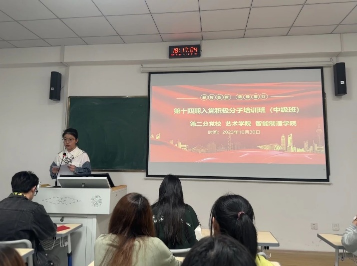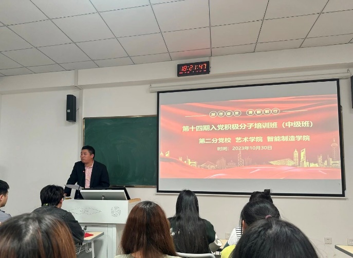 为了帮助入党积极分子进一步掌握党的知识,提高素质,切实保证新发展党员的质量,保持党组织的先进性和纯洁性,提高党的战斗力,2023年10月30日18:00,第二分党校以线下讲堂的方式开展第十四期入党积极分子培训班(中级班)。出席本次开班仪式的有艺术学院党总支副书记杨莉、智能制造学院直属党支部副书记温友保、艺术学院组织委员涂天缘、智能制造学院组织委员高徐辉。本次入党积极分子培训班(中级班)由艺术学院组织委员涂天缘主持。