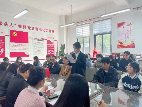 最后,党总支书记戴红梅同志为刘桐炎同志佩戴党徽,支部全体党员表示祝贺。学生党支部书记杨莉同志做总结讲话,杨莉书记首先向刘桐炎同志表示祝贺,并提出殷切希望,希望刘桐炎同志要进一步坚定理想信念,严格按照共产党员的标准要求自己,不断提高党性修养,以身作则、率先垂范、加强学习、发扬优良的工作作风,为学校发展和党组织建设做出更大贡献。同时,她要求与会的每一名党员都要发挥共产党员的先锋模范作用,以实际行动推动学习贯彻习近平新时代中国特色社会主义主题教育走深走实,以自身实际检验学习贯彻成效。