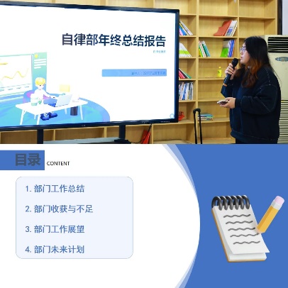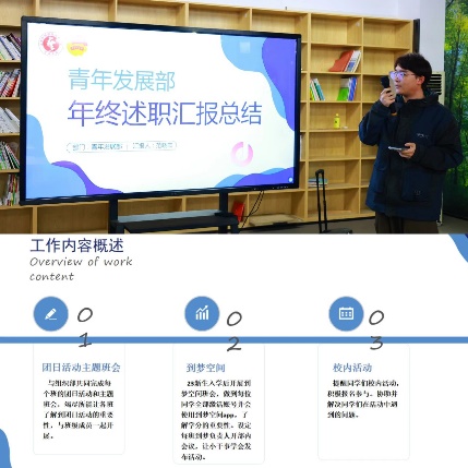 会议伊始,各部门部长分别从2023年度各部门工作进程、工作不足、工作计划等方面展开,进行全方位精细充分的述职。各部长都期望可以在新一年的工作中取长补短,守正创新,共同努力建设更加团结优秀的团委、学生会队伍。