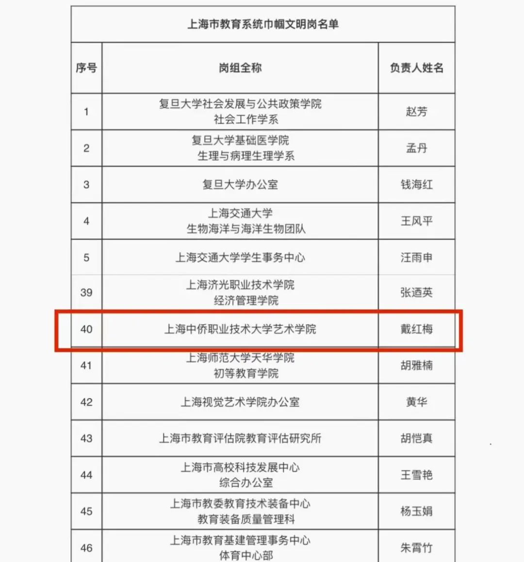 根据上海市教育工会、上海市教育系统妇女工作委员会《关于开展2023年上海市及教育系统巾帼文明岗(巾帼建功标兵)选树活动的通知》(沪教妇[2023]8号),经各单位民主推荐、教育系统妇工委组织评审,复旦大学社会发展与公共政策学院社会工作学系等80个岗组被评为上海市教育系统巾帼文明岗。上海中侨职业技术大学艺术学院也在学院党总支书记、副院长戴红梅老师的带领下荣登榜单!