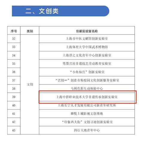 按照《关于开展上海市青年发展型城区、街镇建设试点的意见》(沪青联席办发〔2022〕2号)和《上海青年发展型城市建设“五大服务计划”行动方案》中建设上海青少年创新实验室的有关要求,艺术学院由党总支书记、副院长戴红梅牵头的“上海中侨职业技术大学非遗传承创新实验室”成功入选第二批上海青少年创新实验室(市级)。