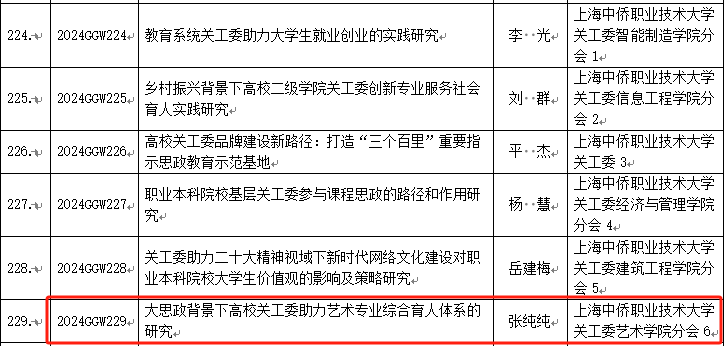 近日,据各单位面上课题申报情况,经研究,确定复旦大学“高校关工委助力大思政教育的实践研究”等263个课题为第17次(2024年)上海市教育系统关心下一代工作立项课题。其中,上海中侨职业技术大学艺术学院辅导员张纯纯老师负责的《大思政背景下高校关工委助力艺术专业综合育人体系的研究》课题成功立项!