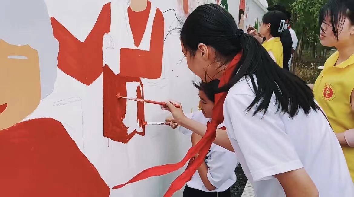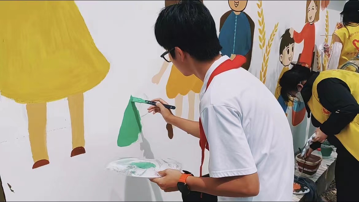 在艺术学子们将画作的大框架完成后,来自亭新中学的小朋友们也加入到绘画的队伍中,他们在艺术学院学长学姐的帮助教学下,绘制了一些简单的涂鸦。在绘画过程中,小朋友们接受着敬老精神的熏陶,在他们稚气青涩的笔下,也绘制出了一个个动人的画面。
