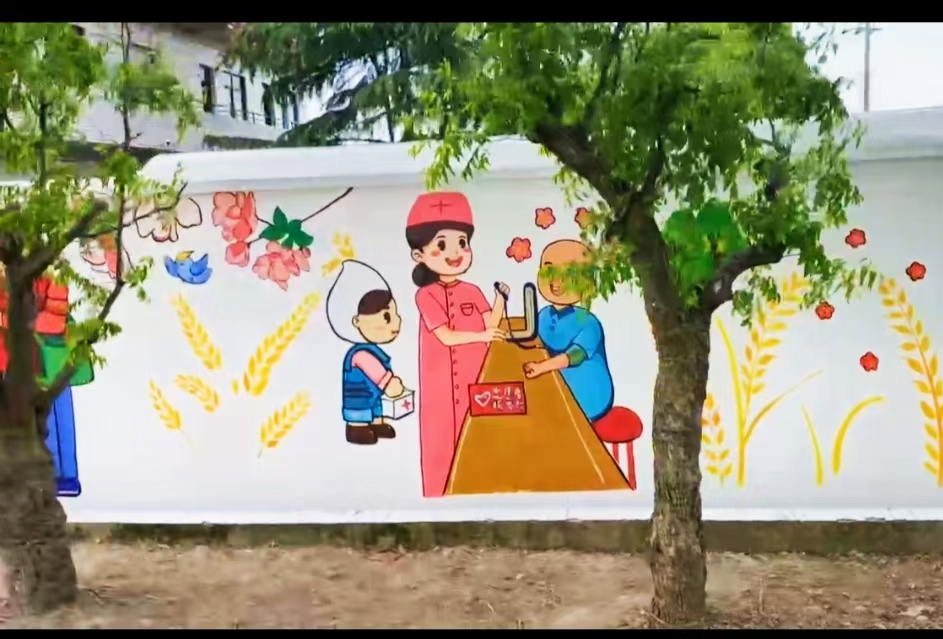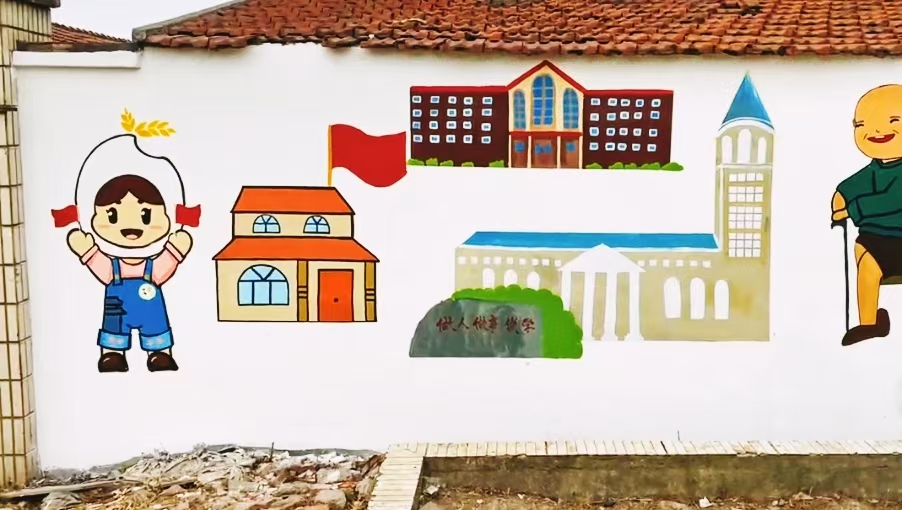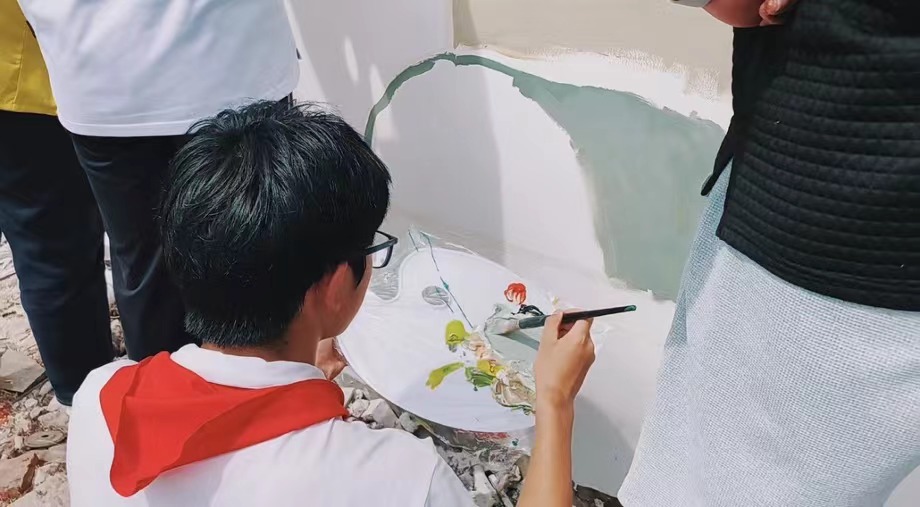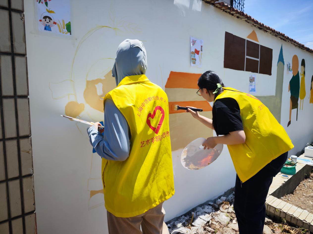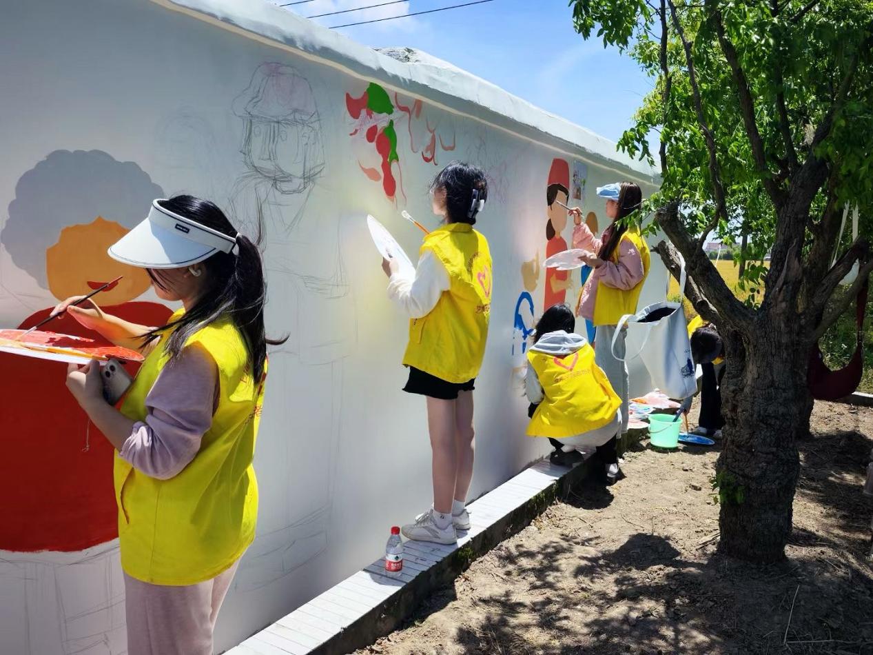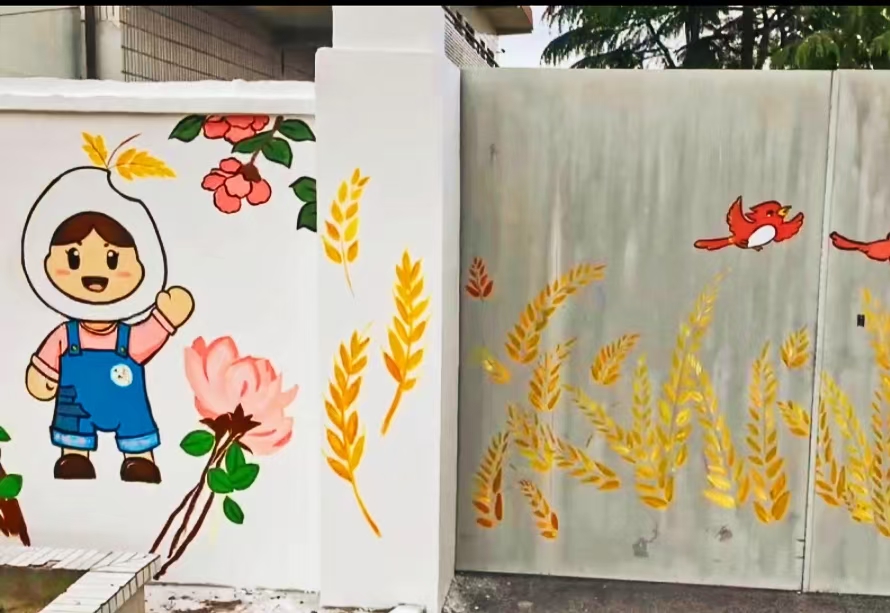 最后让我们来欣赏一下由上海中侨职业技术大学艺术学院“美丽乡村”志愿者服务队与亭新中学同学们共同完成的墙绘作品吧。