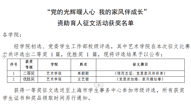 中国共产党冲破沉沉黑夜,点燃革命星火,掀起了气壮山河的惊雷巨澜,在党的光辉的照耀和指引下,同学们有了优秀精神的引领与深刻思想的指导,他们在这样的环境下茁壮成长,书写出自己人生的绚烂篇章。恭喜单颖颖同学获得“党的光辉暖人心 我的家风伴成长”征文活动二等奖,王艺璇同学获得“党的光辉暖人心 我的家风伴成长”征文活动优胜奖。