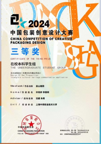 上海中侨职业技术大学艺术学院为培养优秀的视觉传达专业人才,近几年来鼓励师生积极参加各类比赛,以赛促学,进一步提升广大师生对各类赛事的兴趣,从而不懈努力为培养学生职业艺术创新能力作提升与探索。艺术学院在文创设计教学中,提供高水平的教学资源和专业指导,为学生在各类赛事中推荐广阔的创作空间和丰富的展演实践机会。