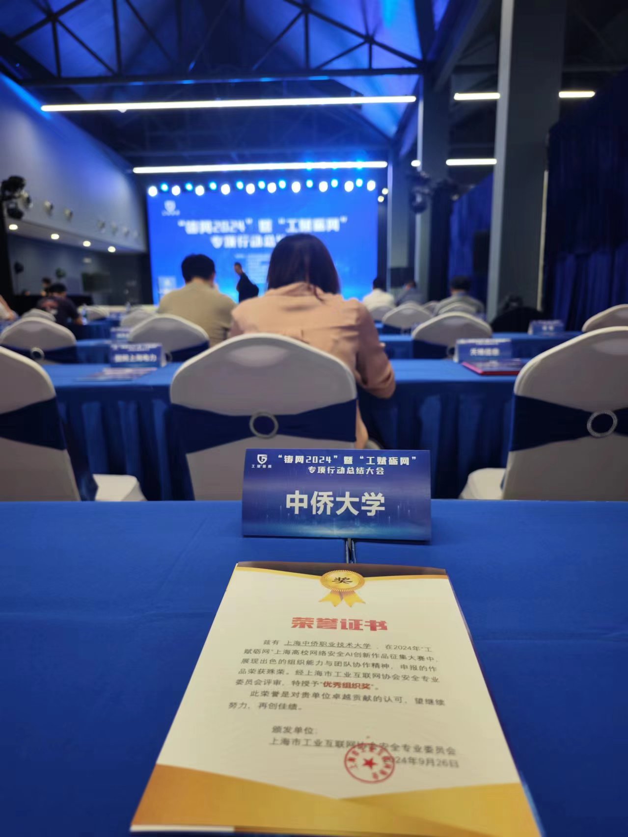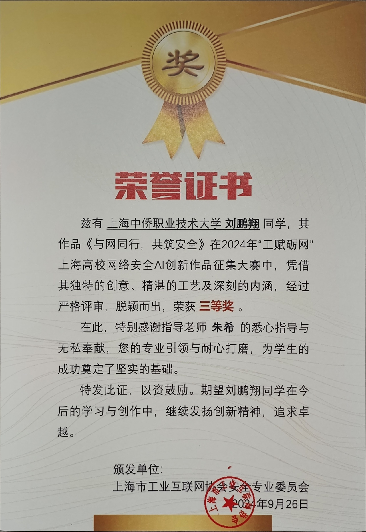 2024年9月26日,上海迎来了“铸网2024”暨“工斌砺网”专项行动总结大会的盛大召开。此次大会不仅是对过去一年上海网络安全与技术创新工作的全面回顾,更是对未来网络发展的展望与规划。在这场科技盛宴中,上海中侨职业技术大学艺术学院2024专升本学生刘鹏翔同学,凭借其在上海高校网络安全AI创新创意绘画大赛中的出色表现,首次,也是唯一一位为此次活动设计海报并荣获三等奖的中侨大学学生。为此主办方为中侨大学艺术学院颁发了优秀组织奖。