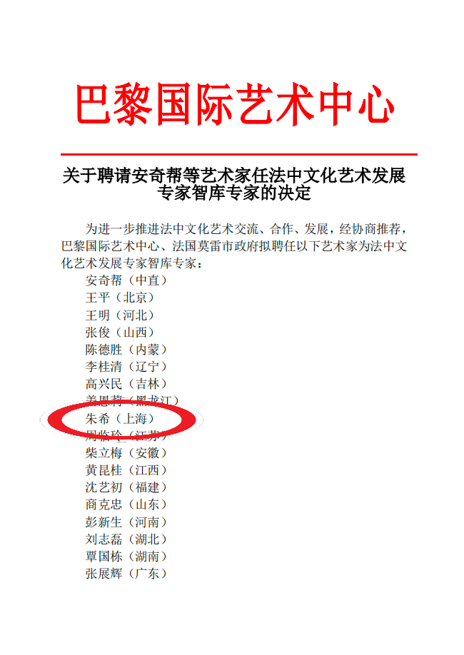 正值中法建交六十周年这一具有重要意义的时刻,朱希教授凭借多年来在中法艺术交流中的突出表现与作品的魅力,被任命为中法文化艺术智库专家组成员,该奖项由巴黎国际艺术中心和雷莫市政府联合颁发,朱希教授也成为上海市唯一获此殊荣的艺术家。