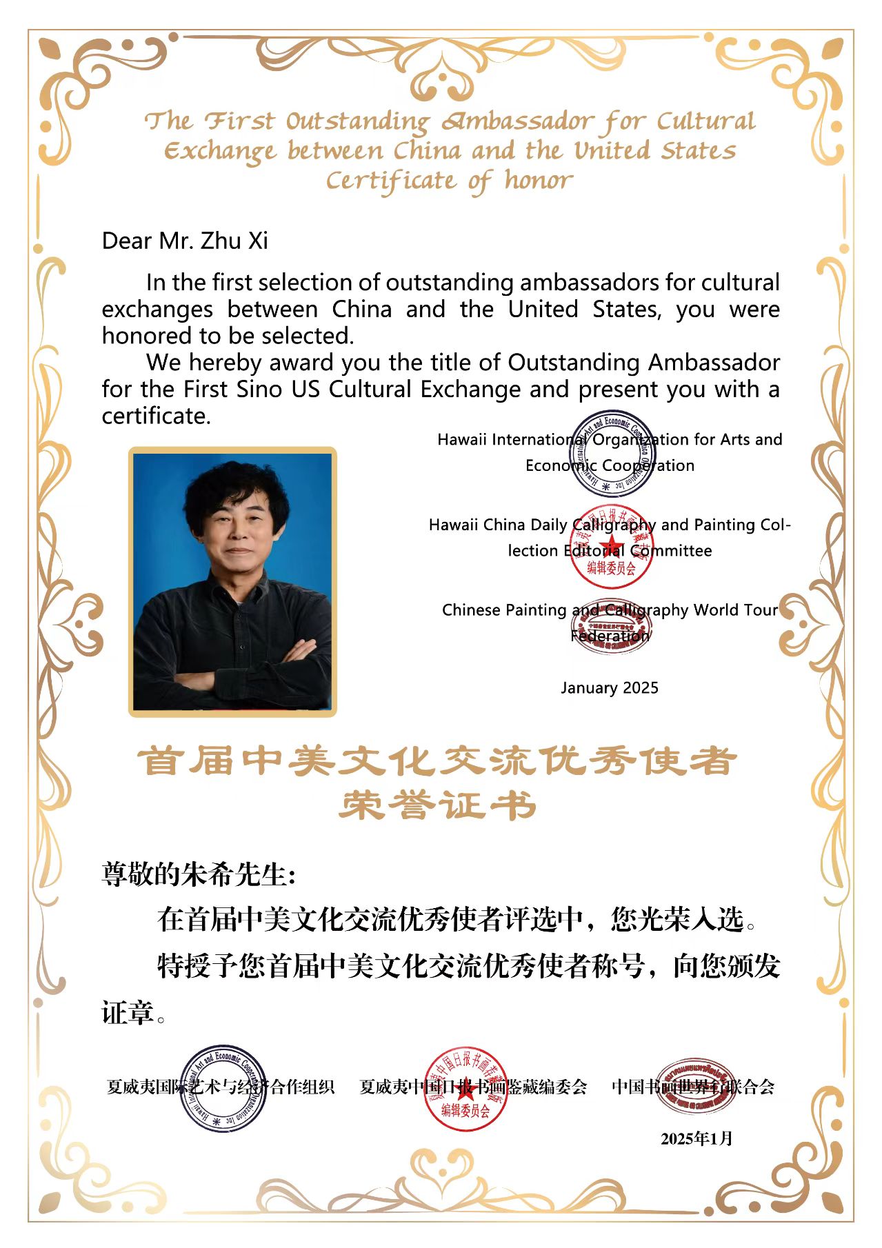 在国际艺术交流舞台上,近年来朱希教授的影响力远不止于欧洲。在第二届夏威夷国际书画大展活动中,朱希教授同样展现出非凡的实力。他带去的油画作品《原野之晨》,以其行云流水般的笔法、深邃悠远的文化内涵,以及独特的个人风格,在众多参展作品中脱颖而出,荣获"特别荣誉奖",被夏威夷国际艺术与经济合作组织、夏威夷中国日报书画鉴藏编委会、中国书画世界行组委会共同授予“首届中美文化交流优秀使者”称号荣誉。为中美文化的交流又作出了重大贡献。