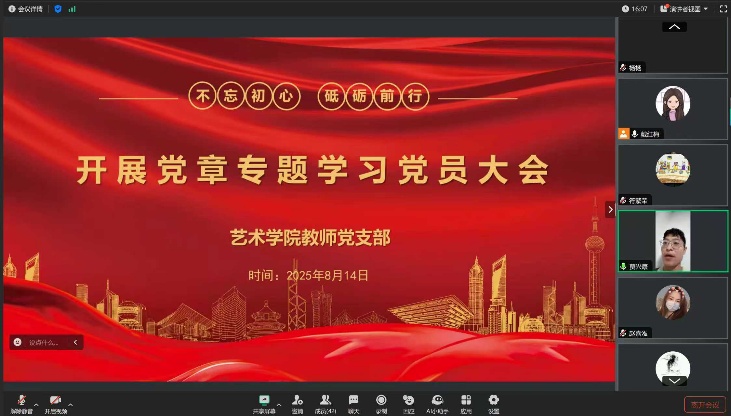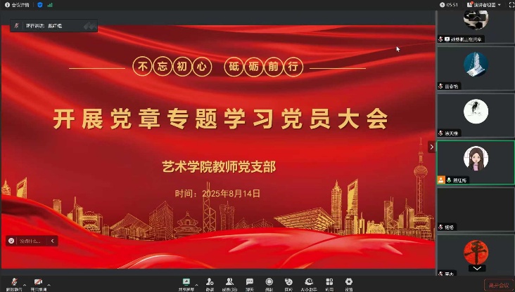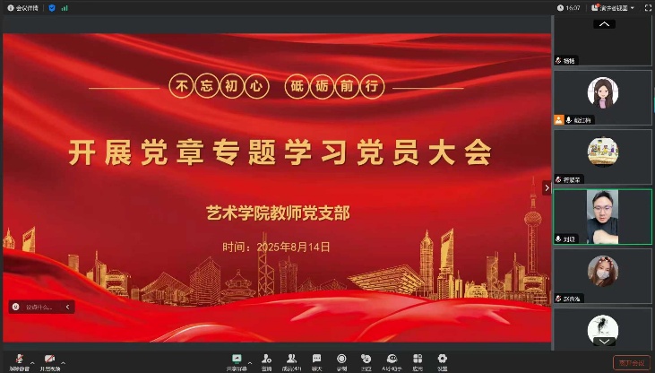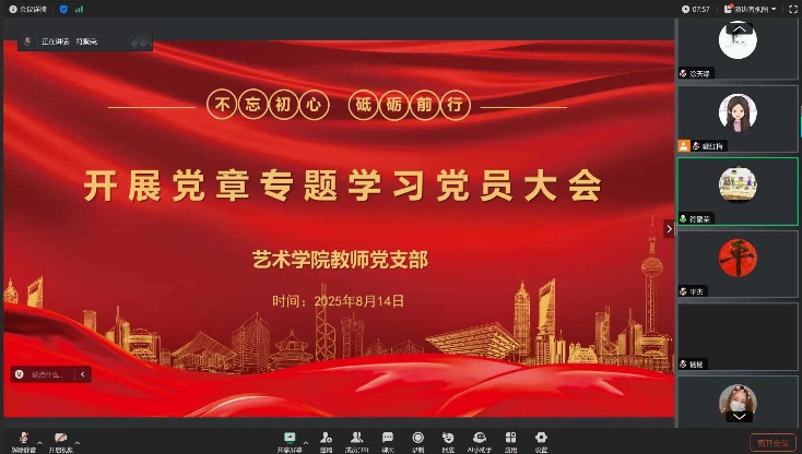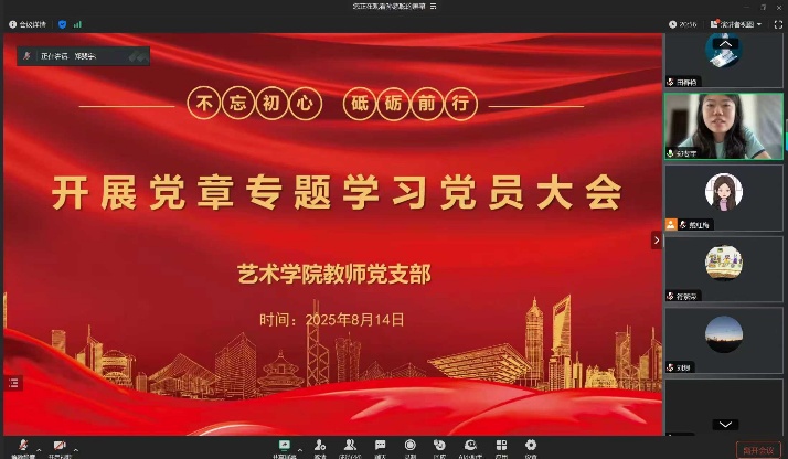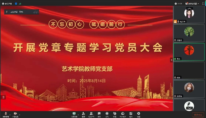 2025814日,艺术学院教师党支部全体党员齐聚“腾讯会议”云端,开展党章专题学习。校党委书记平杰教授,校副校长、艺术学院党总支书记戴红梅教授,党总支副书记杨莉,学院副院长符繁荣教授及艺术学院教师党支部全体党员参加了此次会议。